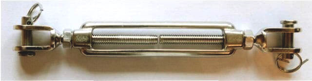 This particular type of stainless turnbuckle is designed for use in boat rigging, securing masts with guy ropes and many other engineering and commercial applications. These robust devices consist of a central threaded body with jaw-style fittings at each end, enable secure attachment and precise tension adjustment. The jaws on either end are simply attached to shackles, wire ropes, pad eyes and other connectors.